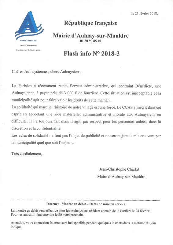 A noter que ce flash a également permis à la municipalité d’informer officiellement les Aulnaysiens des dates de la montée en débit annoncées notamment en conseil municipal le 13 février dernier