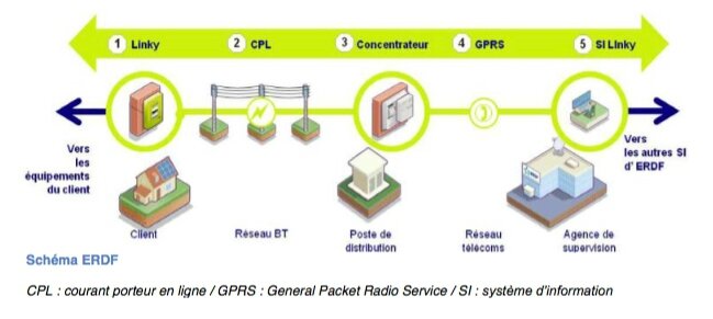 Les données transitent du compteur Linky vers les concentrateurs locaux (transformateurs), par courants porteurs, via le réseau électrique lui-même,.